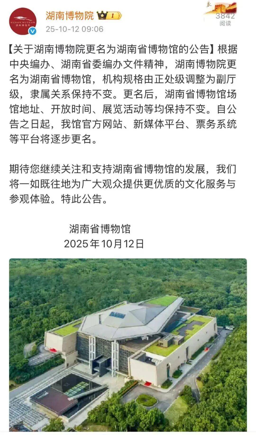 10月12日,湖南博物院发布关于湖南博物院更名为湖南省博物馆的公告:根据中央编办、湖南省委编办文件精神,湖南博物院更名为湖南省博物馆淘优配,机构规格由正处级调整为副厅级淘优配,隶属关系保持不变。更名后淘优配,湖南省博物馆场馆地址、开放时间、展览活动等均保持不变。自公告之日起淘优配,我馆官方网站、新媒体平台、票务系统等平台将逐步更名。期待您继续关注和支持湖南省博物馆的发展,我们将一如既往地为广大观众提供更优质的文化服务与参观体验。特此公告。